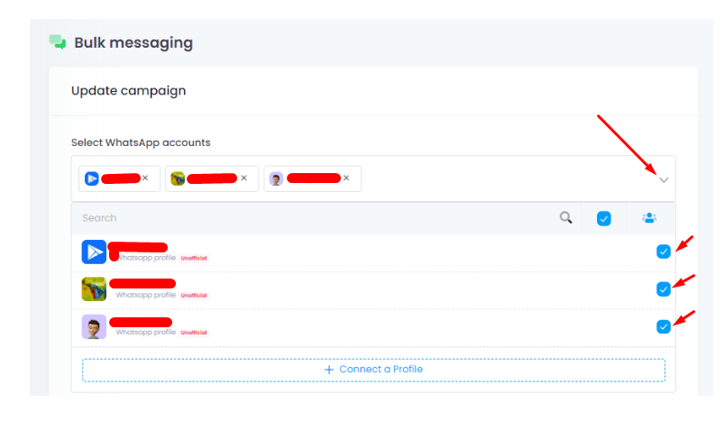 בחר חשבונות WhatsApp: ניתן לבחור חשבון 1 או כמהחשבונות עבור קמפיין 1